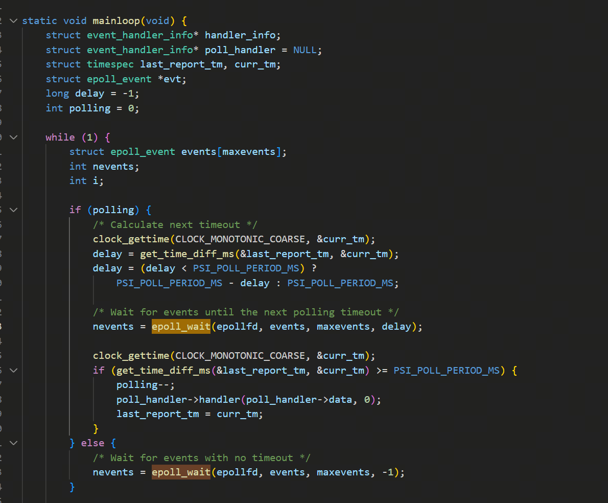 main里的这个主循环函数就是mainloop,mainloop里的逻辑比较简单,就是循环进行epoll_wait: