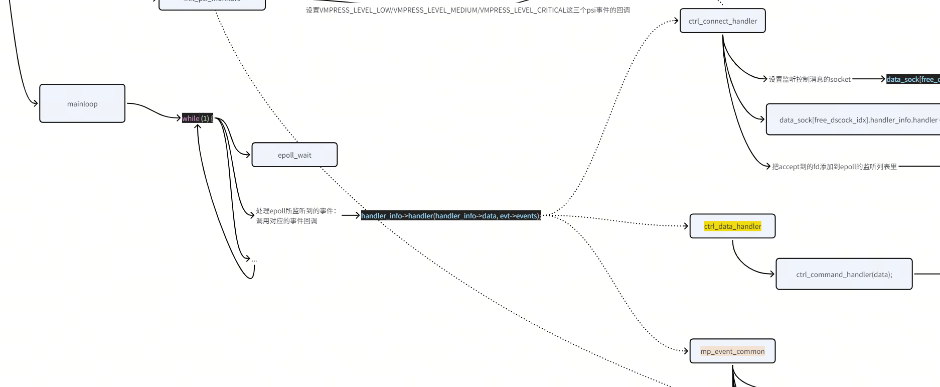 上图里设置的ctrl_connect_handler也是下面 3.2.3 一节里讲到的mainloop里,epoll响应消息的执行的回调的三个种类之一。