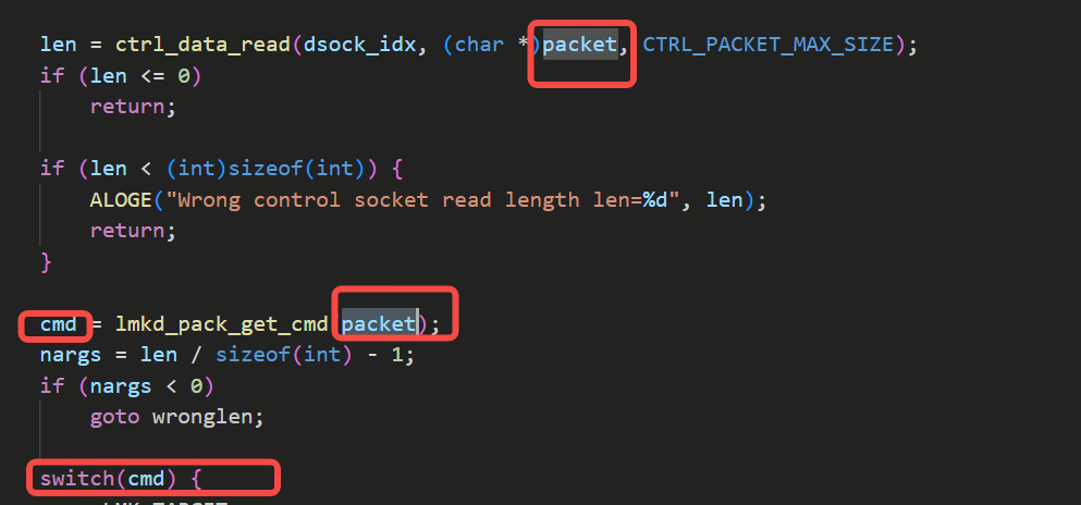 通过序号拿到packet这个字符串首地址,ntohl转换,得到cmd,并进行switch case处理: