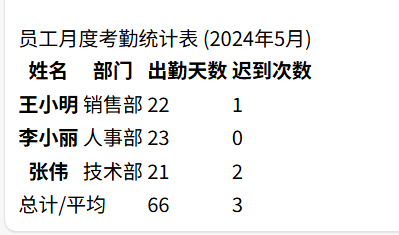 <caption>员工月度考勤统计表 (2024年5月)</caption>