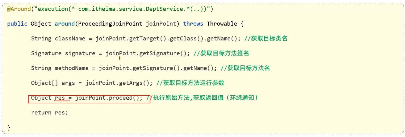 @Around环绕通知方法的返回值,必须指定为Object,来接收原始方法的返回值。