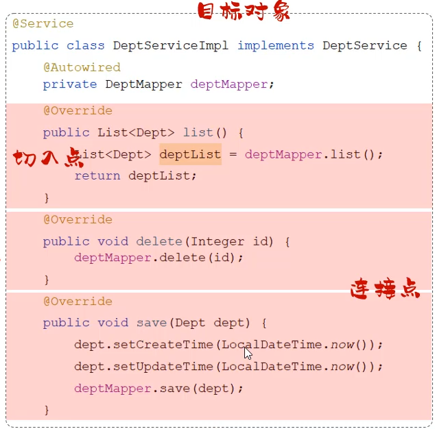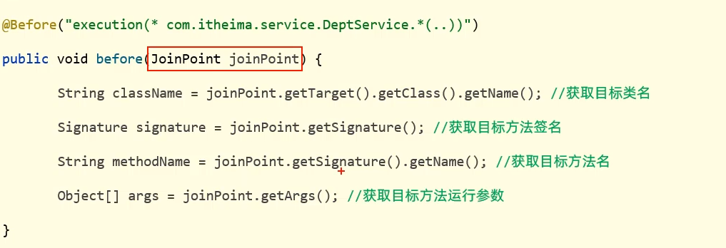 连接点:在Spring中用JoinPoint抽象了连接点,用它可以获得方法执行时的相关信息,如目标类名、方法名、方法参数等。