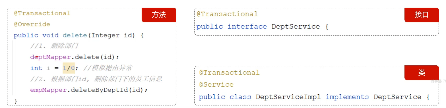 作用:将当前方法交给spring进行事务管理,方法执行前,开启事务;成功执行完毕,提交事物;出现异常,回滚事务