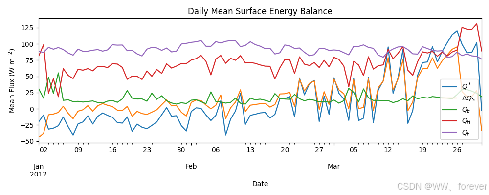 - 能量平衡组成部分:Q*, QH, QE, QS, QF