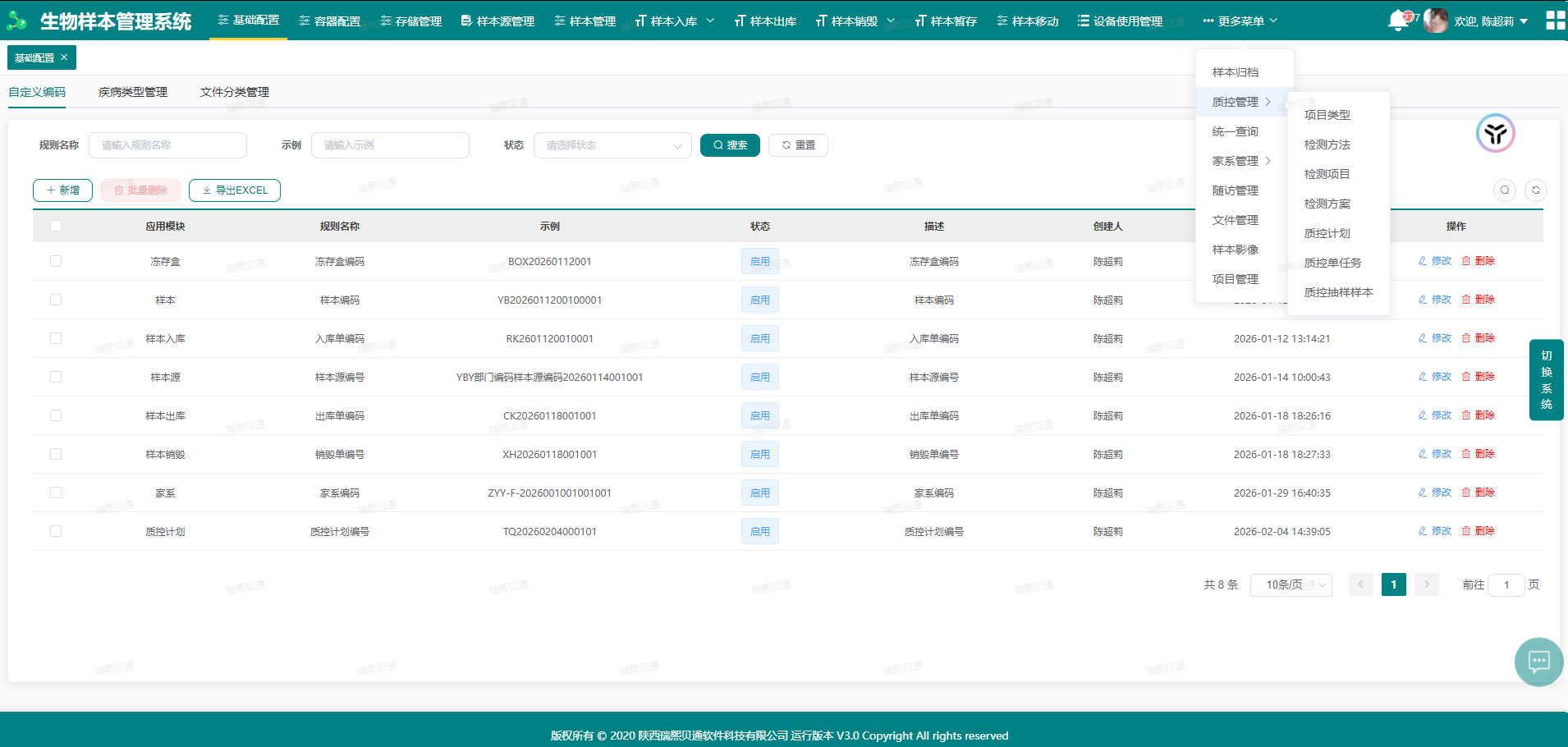 瑞熙贝通生物样本数据库管理系统旨在通过信息手段提高生物样本的管理效率和质量,确保样本的完整性和可追溯性。该系统通常包含样本源采集、样本采集、样本入库、样本出库、样本移动、样本运输、样本制备、仓储管理、样本销毁管理、捐赠者信息/伦理隐私管理、样本全生命周期追逐、质量控制管理、报告管理等多个功能模块,全面覆盖样本管理的各个环节。