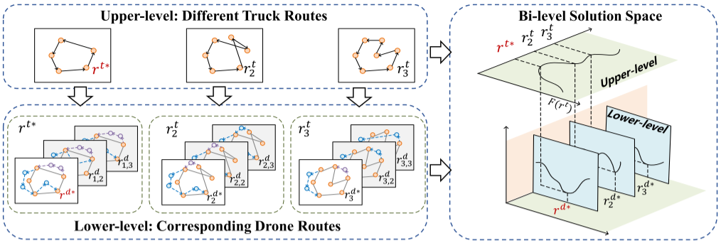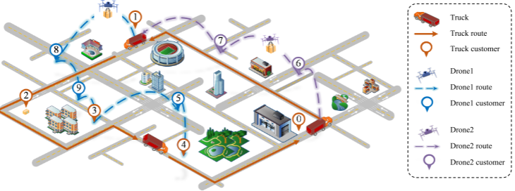 - 下层模型:在卡车路线确定的前提下,负责调度无人机,规划无人机的起降点和飞行顺序(DLR)。