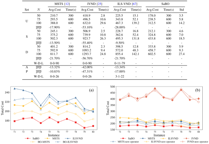 - 在保证极高求解速度的同时,SaBO 算法在大多数实例上显著优于现有的各类先进算法,如 MSTS、IVND、ILS-VND 等。