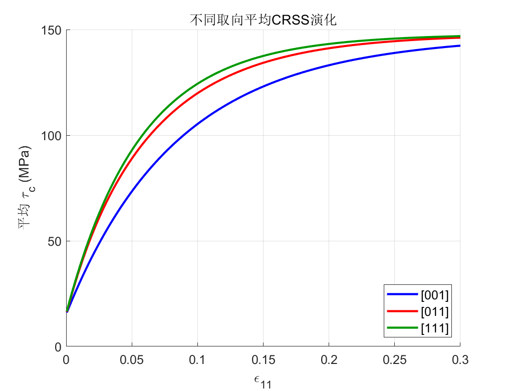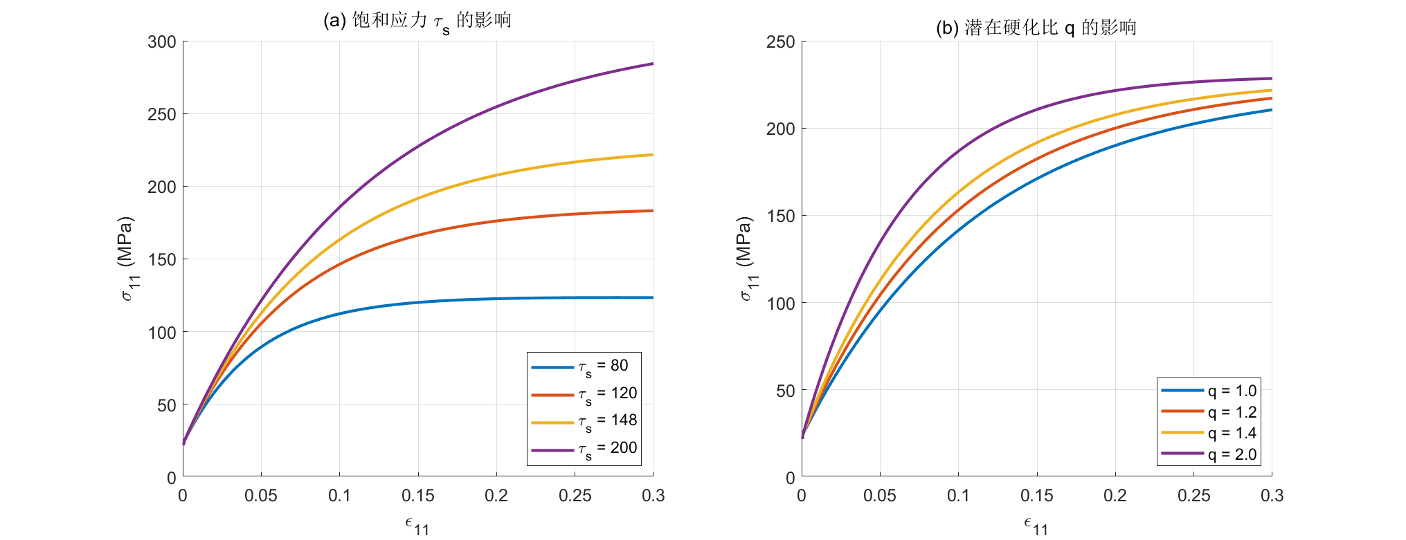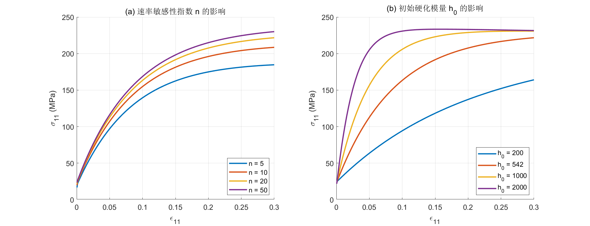 以铜单晶为对象,对所建模型进行了系统的数值验证。单轴拉伸模拟结果表明,应力-应变曲线呈现合理的弹塑性过渡和硬化饱和特征。对[001]、[011]和[111]三个典型晶体取向的对比分析显示,模型能够正确捕捉FCC晶体的力学各向异性:[001]取向因多滑移激活表现最软,[111]取向因Schmid因子最小表现最硬,与经典实验规律一致。参数敏感性分析系统考察了速率敏感性指数n、初始硬化模量h₀、饱和应力τₛ及潜在硬化比q对力学响应的影响,结果表明各参数的调控效果具有明确的物理意义,为后续参数标定提供了依据。