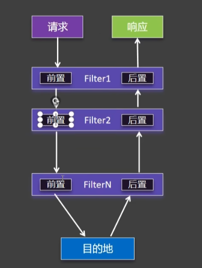 请求经过一系列过滤器链(Filter Chain)后到达目的地,响应再逆向经过过滤器链返回: