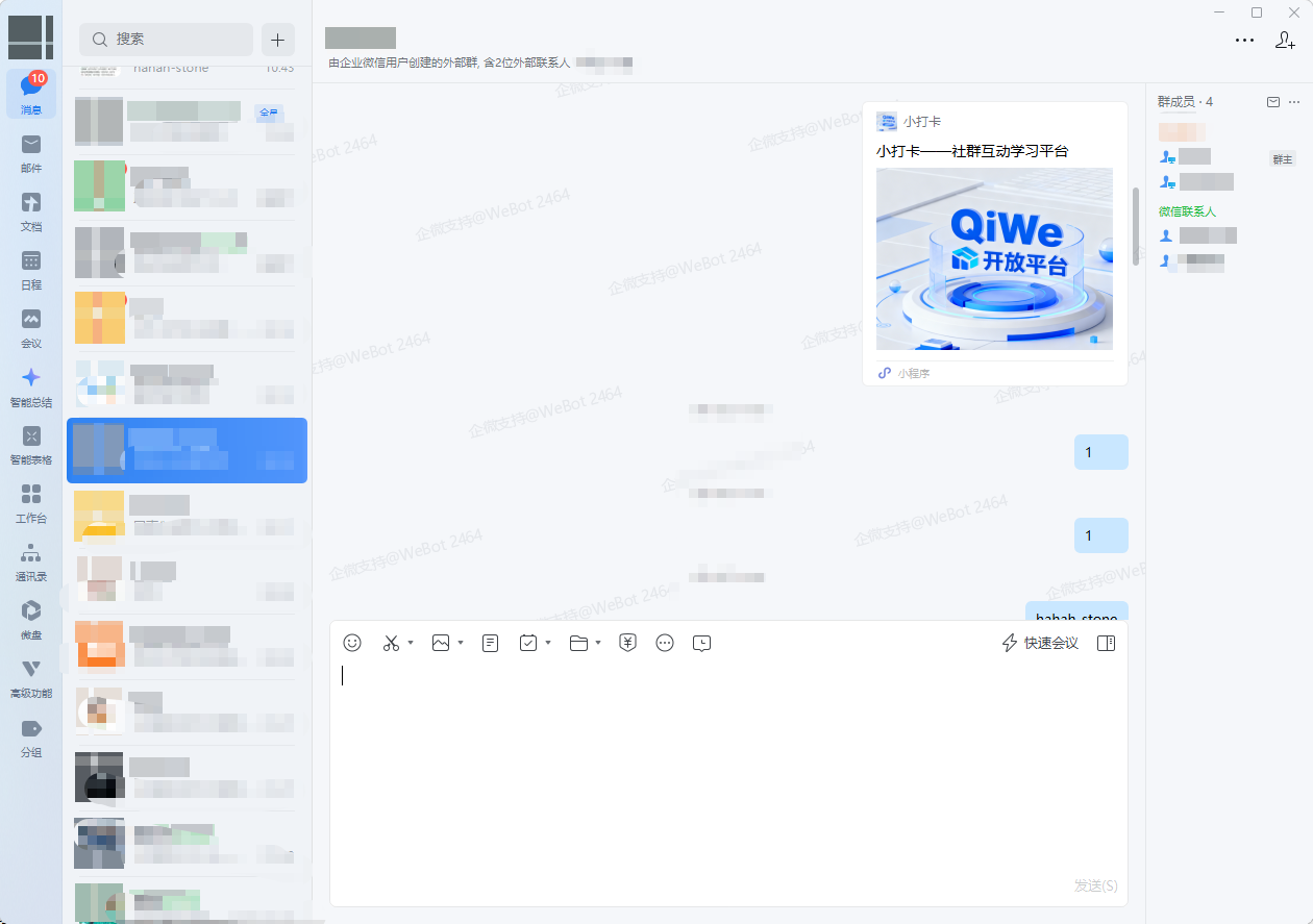 - 单外部群每分钟发送≤3 条小程序消息,避免刷屏触发风控;