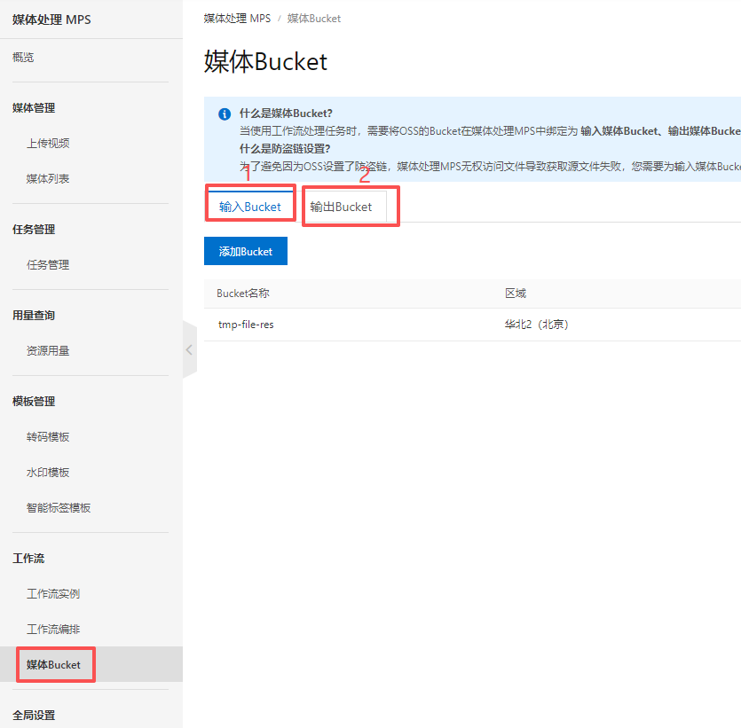 4、添加输入输出的bucket,就是声明一下需要用哪个bucket的文件作为输入输出源,注意输入输出都要选