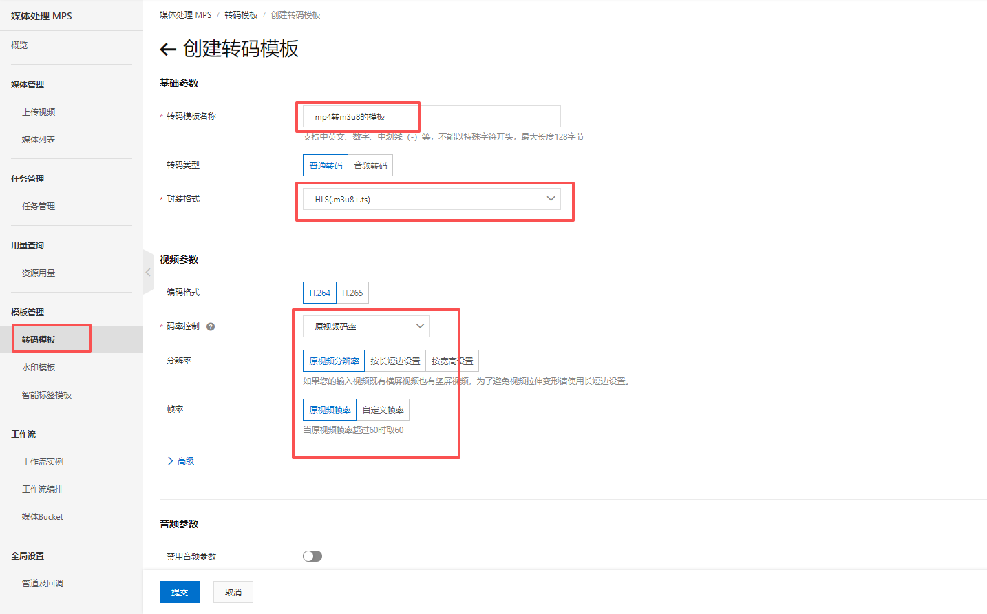 3、创建一个转码模板,所有上传的Mp4视频都按这个模板来转码