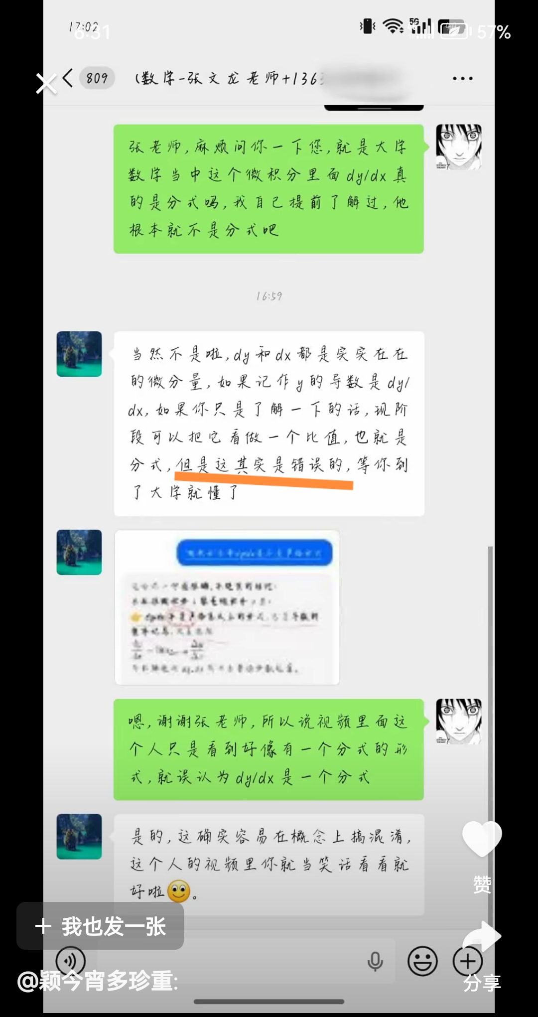 有"老师"说dy/dx不是分式,这个老师连什么是小学数学中分式概念都不懂啊!