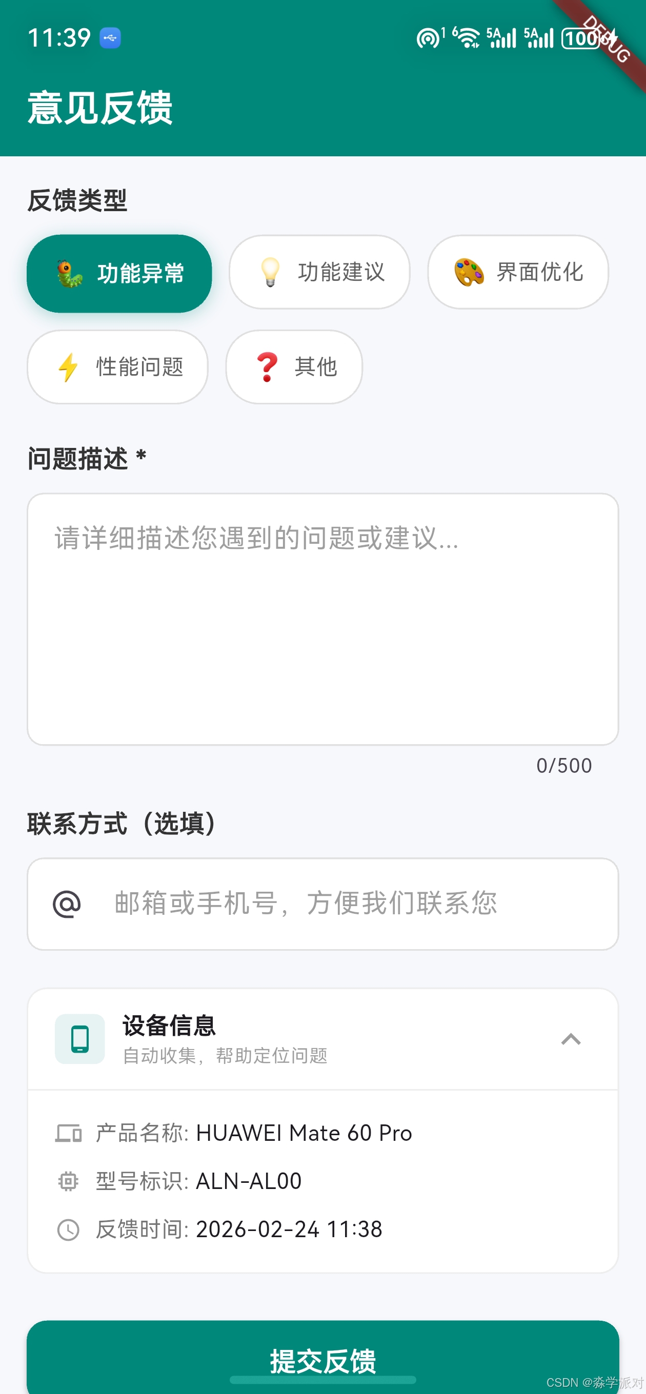 - 结构化提交:反馈数据以 JSON 格式组织,包含反馈类型、内容、设备信息和时间戳