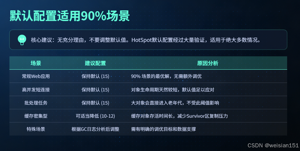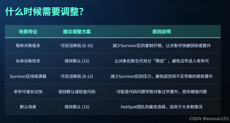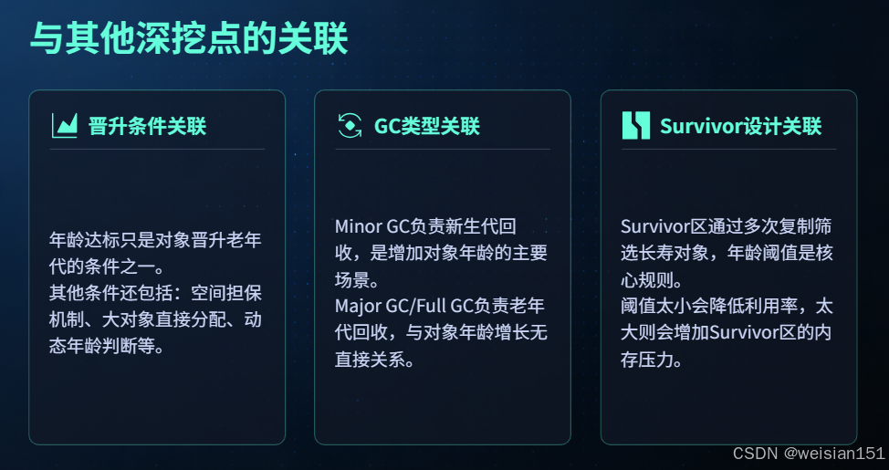 | "调整年龄能解决所有 GC 问题" | 先找根因,年龄阈值不是万能药 |
