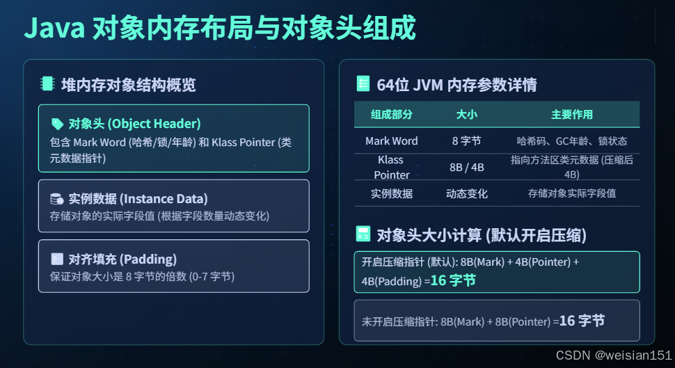 │ 结论:生产环境默认开启压缩指针,对象头通常为 16 字节 │