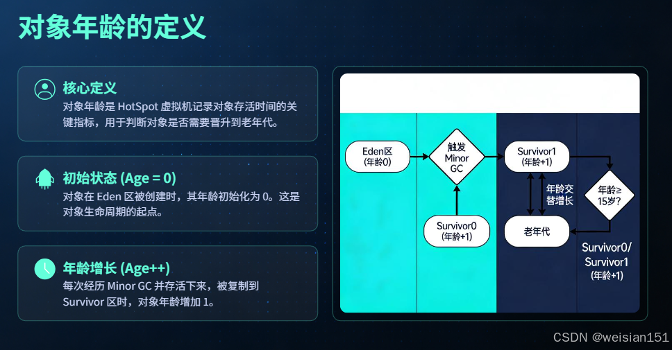 对象年龄(Object Age)是 HotSpot 虚拟机用来记录对象存活时间的指标,每次对象在 Survivor 区之间复制时,年龄 +1。