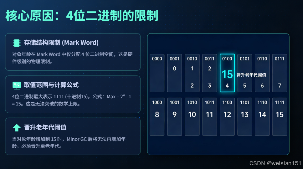 核心原因是对象年龄在对象头中只用 4 位二进制存储。