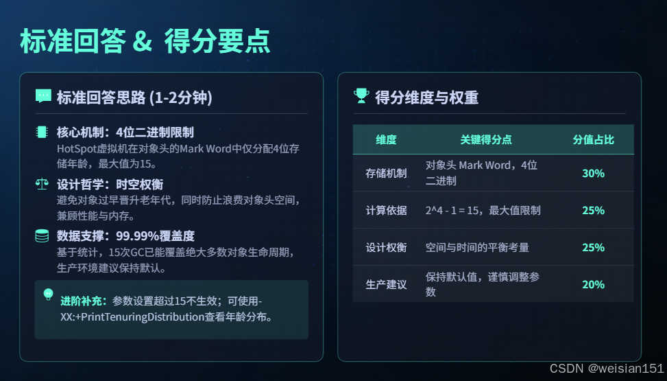 这道题在 Java 中高级面试中的出现率超过 85% ,是堆内存知识的深度延伸 。很多候选人知道"默认 15 次",但被追问"为什么是 15 而不是其他数字"时,往往哑口无言。理解这个设计背后的技术考量,能让你在面试中展现超越常人的深度。