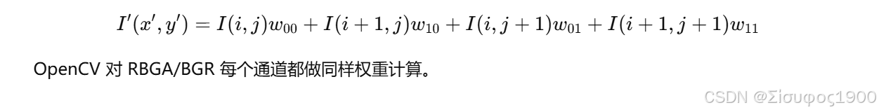 dst.at<Vec3b>(row, col)[k] = (1. - u) * (1. - v) * src.at<Vec3b>(top_y, left_x)[k];