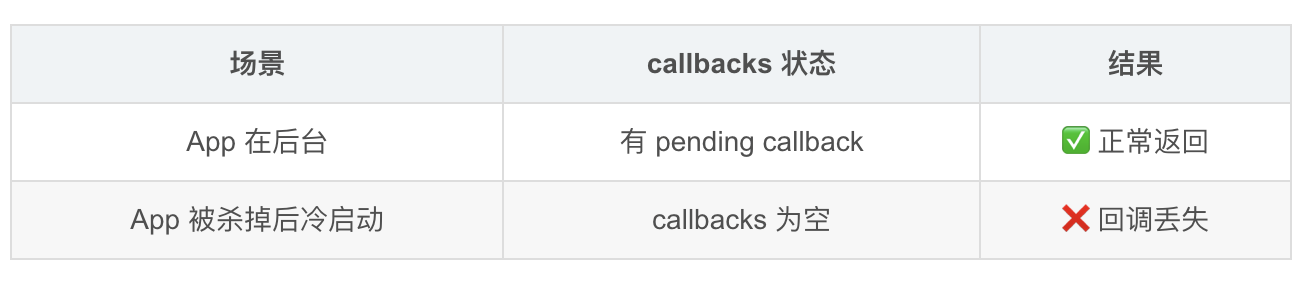 📌 冷启动场景下认证回调会丢失。这是所有平台都存在的问题------如果 App 在浏览器认证期间被系统杀掉,认证结果就无法回传。实际上这种情况很少发生,因为认证过程通常很快。