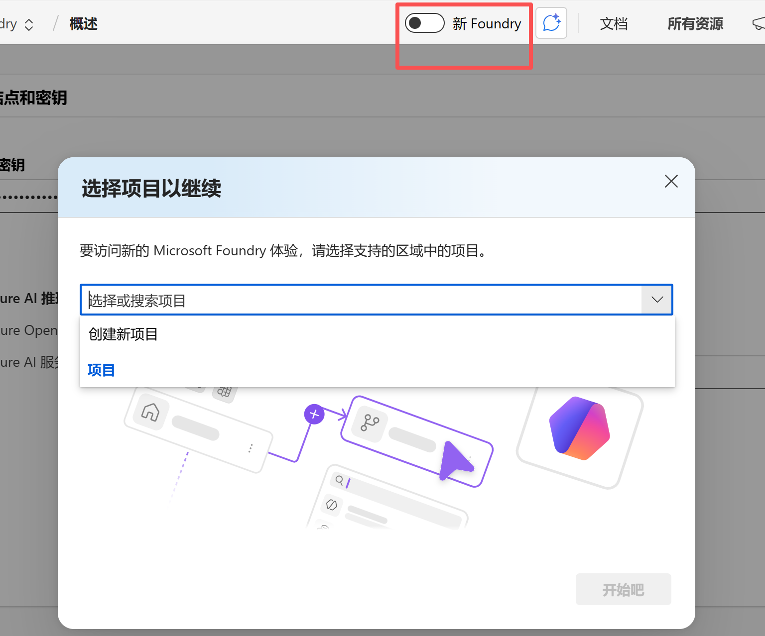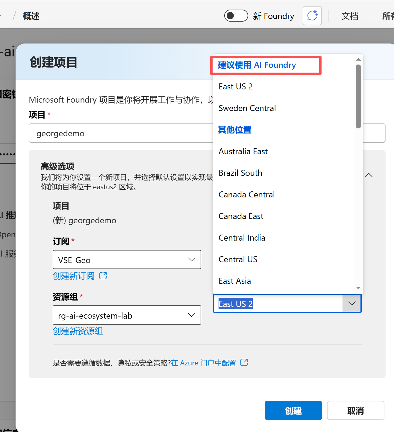 现在推荐的是项目优先的创建模式。当你创建一个新项目时,Azure AI Foundry会在后台自动完成一系列复杂的配置: