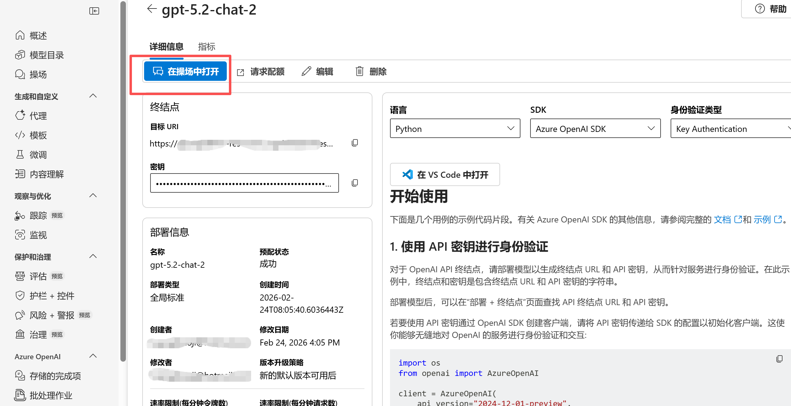 模型部署成功后可以看到如下的内容,点击【在操场中打开】,跳转到操场对这个模型进行使用。操场的核心:快速测试已部署的模型,进行对话或提示词调试。