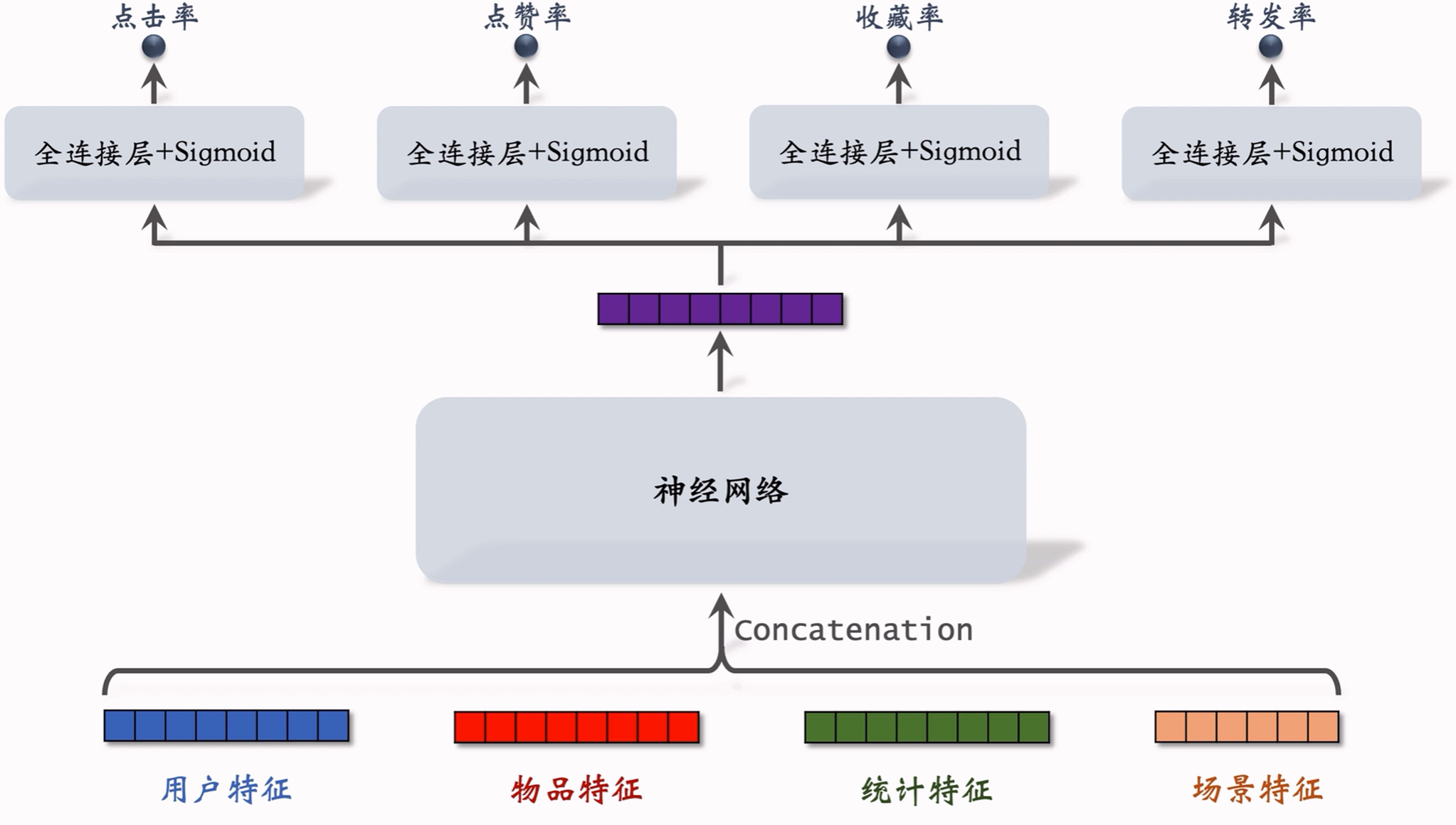 - 排序模型预估点击率、点赞率、收藏率、转发率等多种分数;