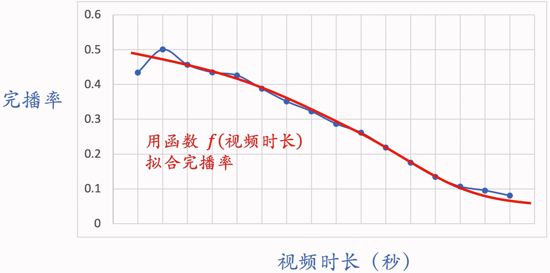 预估完播率是通过用户、物品等很多信息预测出的一个完播率的估计值,而 f ( 视频长度 ) f(\text{视频长度}) f(视频长度)是一个只与视频长度有关的拟合函数。