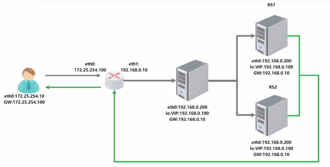 关键:RS 的默认网关必须指向 VS 的内网 IP(192.168.0.100),否则响应报文无法回传给 VS,导致客户端无法收到结果。
