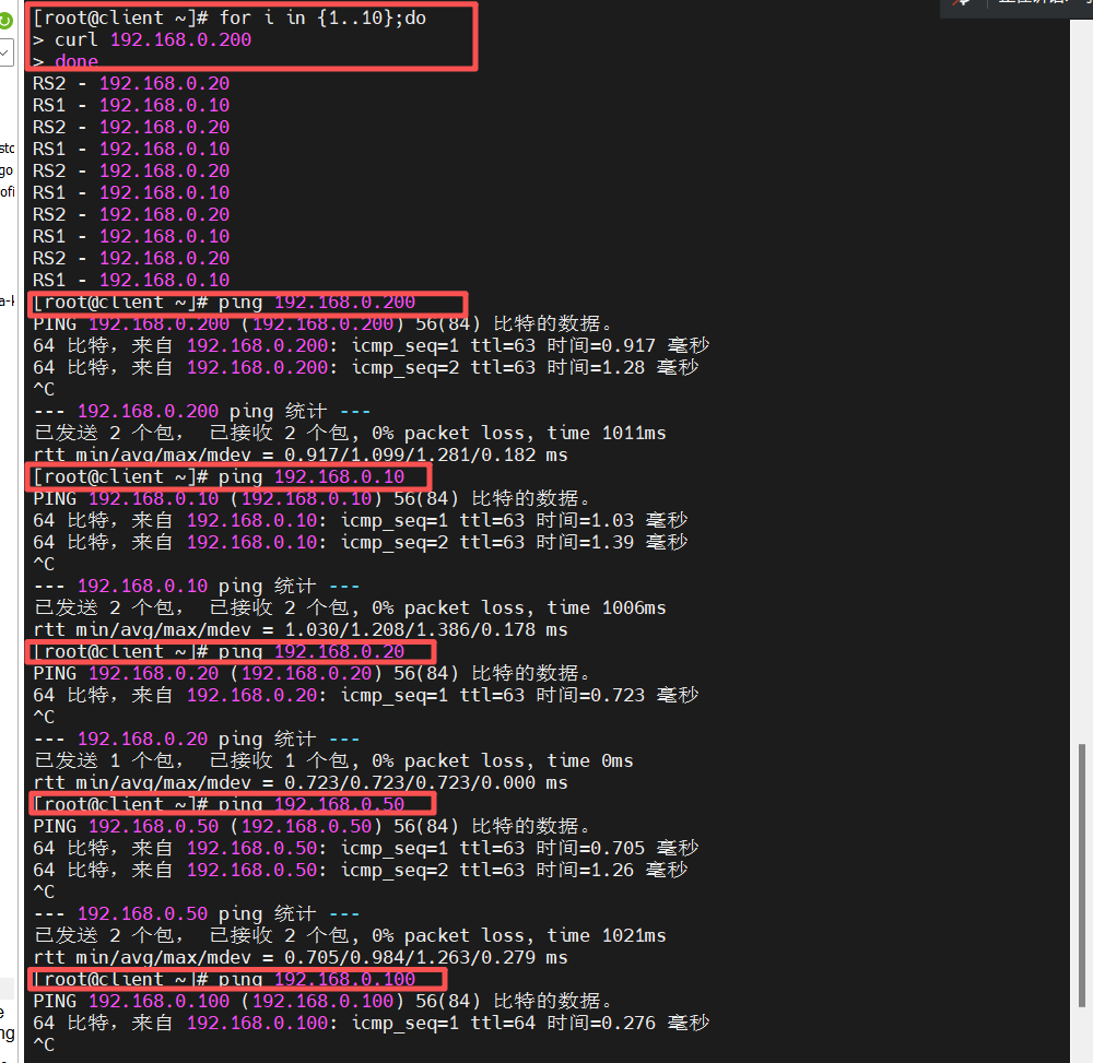 - 操作:客户端多次访问虚拟服务 IP(192.168.0.200);