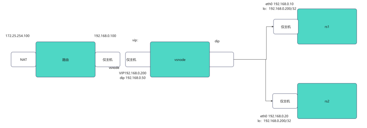 | VS(vsnode) | eth0: 172.25.254.100(公网 / 外部网段)eth1: 192.168.0.100(内网 / RS 网段) | 负载均衡器(LVS 节点) |
