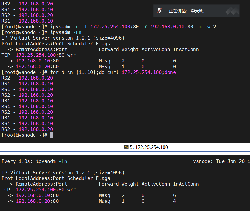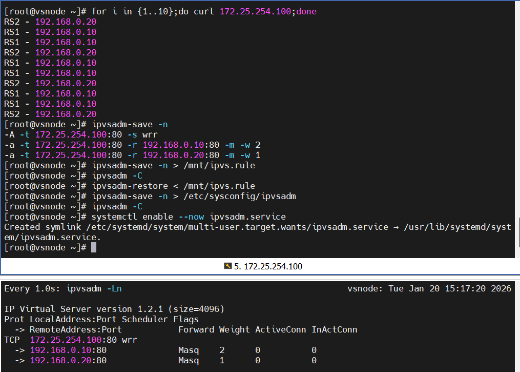 pro:协议(TCP/IP);expire:连接过期时间(如 01:56 表示 1 分 56 秒后过期);state:连接状态(FIN_WAIT 为关闭阶段,ASSURED 为稳定连接);source:客户端 IP + 端口(172.25.254.99);virtual:虚拟服务 IP + 端口(192.168.0.200:80);destination:后端服务器 IP + 端口(192.168.0.20:80);- 核心结论:客户端的多个连接均指向同一后端服务器,验证了会话粘滞的有效性。