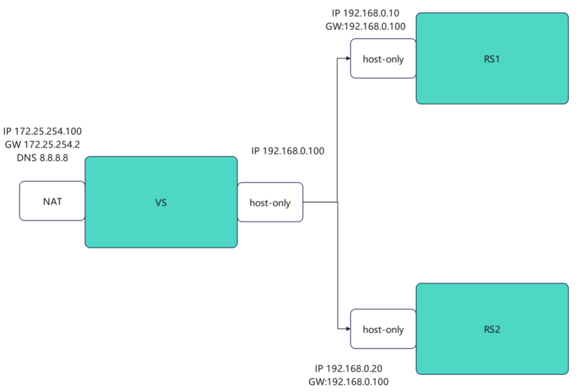 | RS1 | eth0: 192.168.0.10网关:192.168.0.100 | 后端真实服务器 1 |