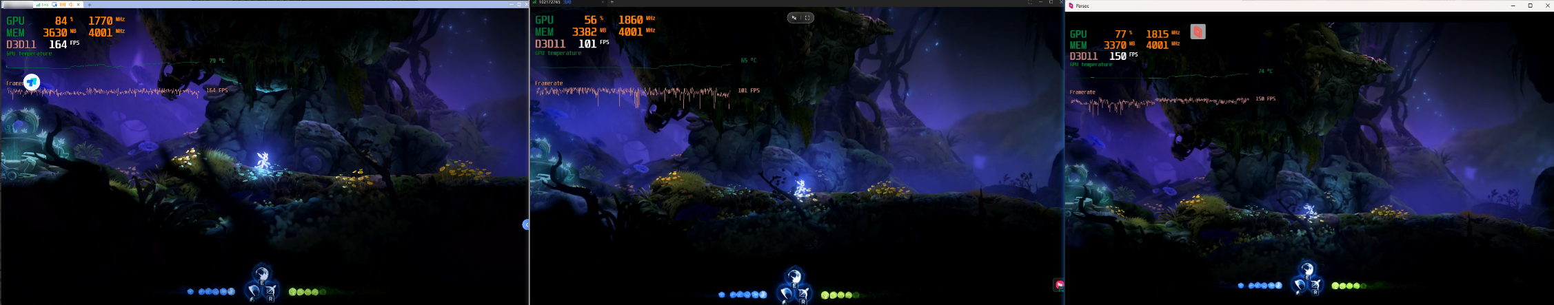 ToDesk提供了稳定的高帧率(164FPS),确保游戏过程流畅且无卡顿,在GPU和内存使用方面表现优秀。向日葵虽然在帧率上略有下降,但依然能保持较好的流畅性。而Parsec在低延迟和帧率稳定性上表现突出,适合需要快速响应的游戏体验。