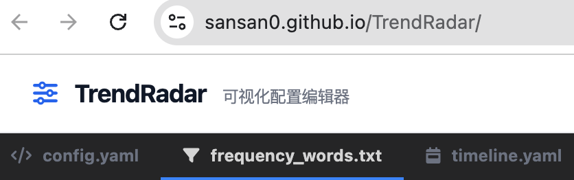 config.yaml:配置frequency_words.txt:频率词,timeline.yaml:时间线,配置调度频率和模式