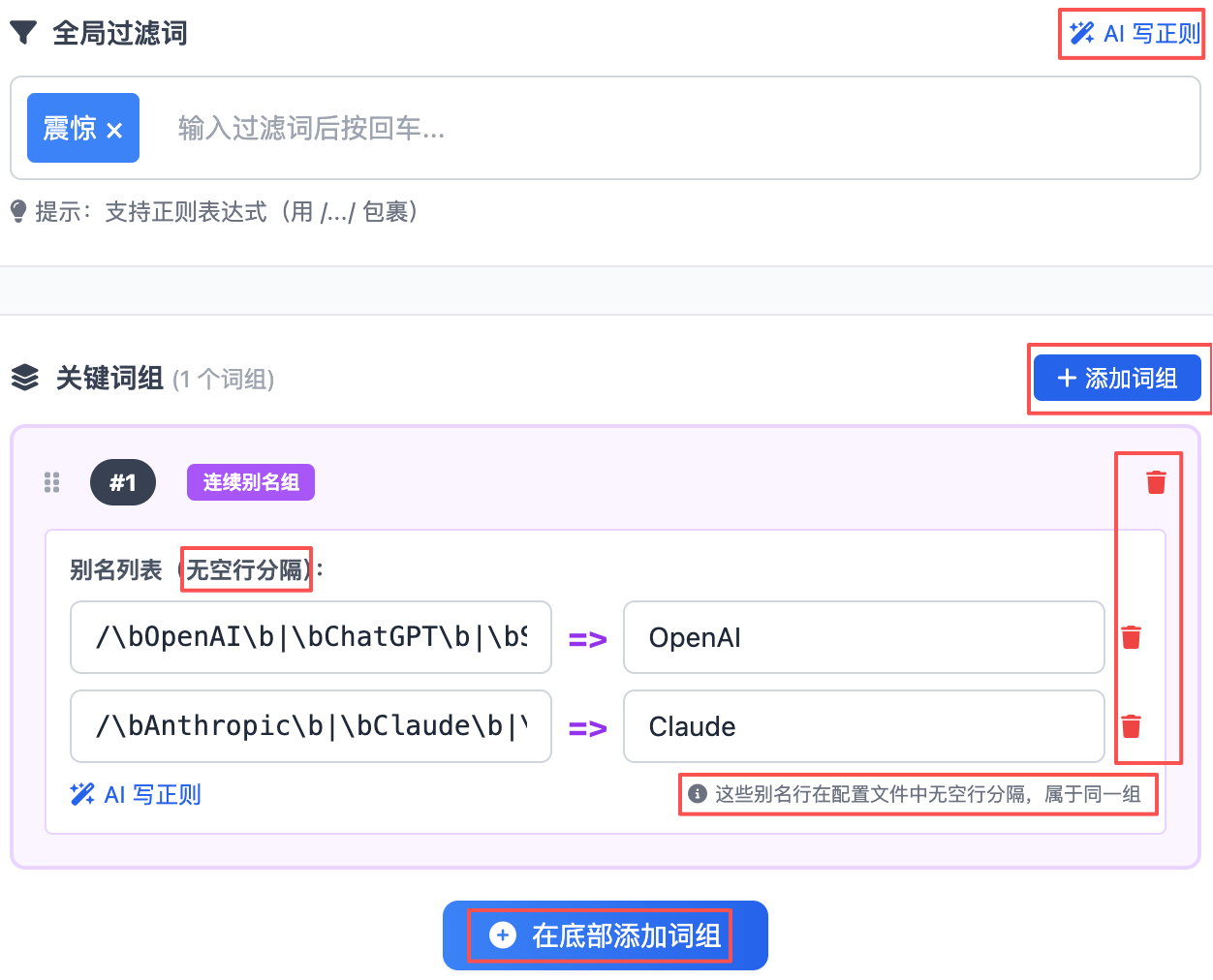 自定义显示文本 | /\bai\b/=>AI相关 |