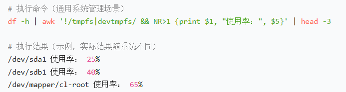 df -h | awk '!/tmpfs|devtmpfs/ && NR>1 {print $1, "使用率:", $5}' | head -3
