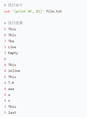 (2)打印每行的字段数(NF)+ 第一列内容($1)