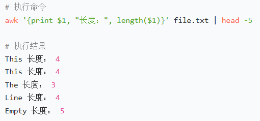 awk '{print $1, "长度:", length($1)}' file.txt | head -5