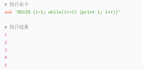 awk 'BEGIN {i=1; while(i<=5) {print i; i++}}'