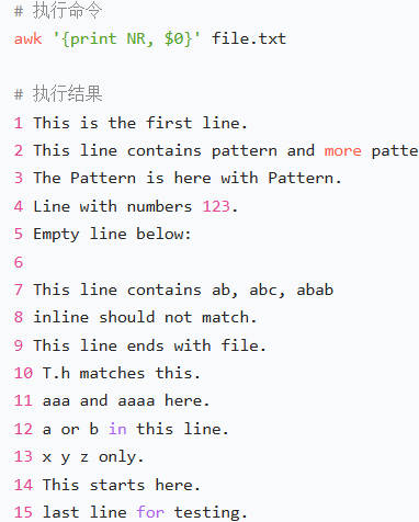 | NR | 当前处理的行号(记录数) | awk '{print NR, $0}' test.txt(打印行号 + 内容) |