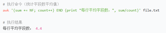 awk '{sum += NF; count++} END {print "每行平均字段数:", sum/count}' file.txt
