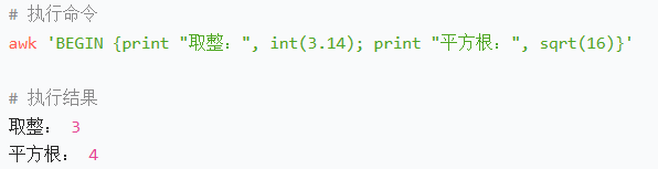 awk 'BEGIN {print "取整:", int(3.14); print "平方根:", sqrt(16)}'