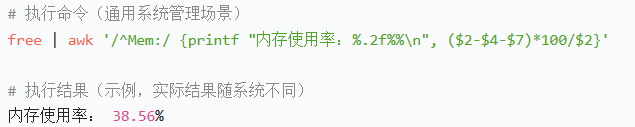 free | awk '/^Mem:/ {printf "内存使用率:%.2f%%\n", ($2-$4-$7)*100/$2}'