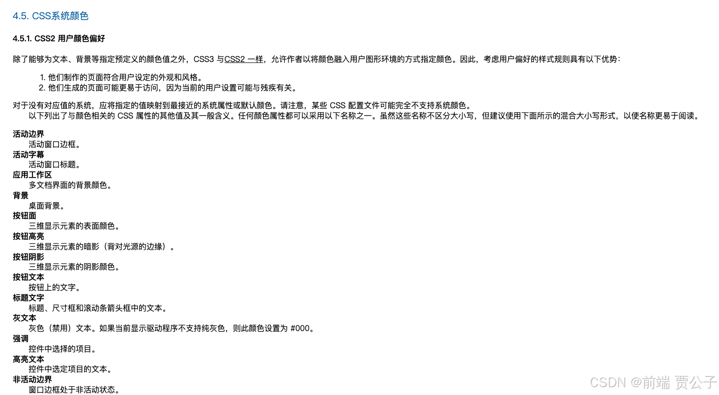 我们可以看到我们并没有给上述的任何标签设置 CSS 样式,但浏览器仍然渲染出了默认的样式,这里我们关心的是它们的默认颜色,比如字体颜色,button 标签的边框颜色、背景颜色,复选框、单选框的选中颜色。当我们没有给它们设置颜色的时候,这些标签会使用CSS 系统颜色 ,那么这些系统颜色是什么呢?那么可以从官方文档中找到:CSS System Colors。