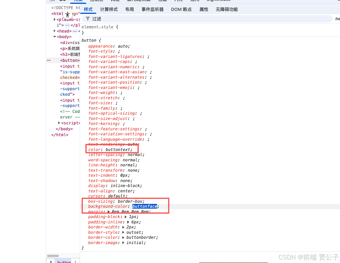 有一些的 HTML 标签可以直接在浏览器的开发者工具中查看到使用了哪些系统颜色,比如 button 标签。
