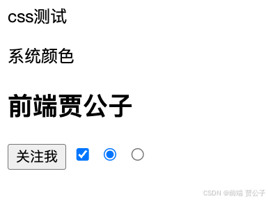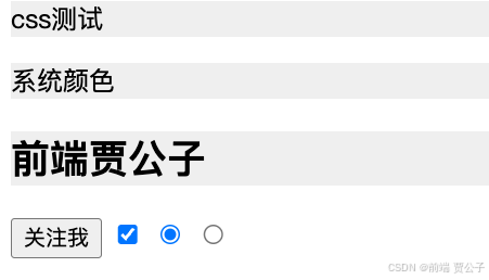 我们可以看到 div、p、h2 标签的文本颜色和背景颜色分别为 checkbox 和 radio 标签的选中时的文本颜色和选中的颜色。