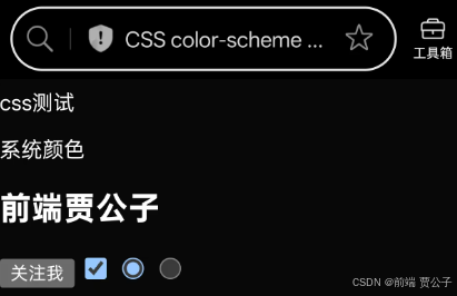 这个时候我们看到渲染结果和操作系统设置暗黑模式时的渲染结果是一样的,而且只需要设置一行代码:color-scheme: dark ,就可以实现一样的效果了,这是浏览器按照暗黑模式进行渲染的结果。