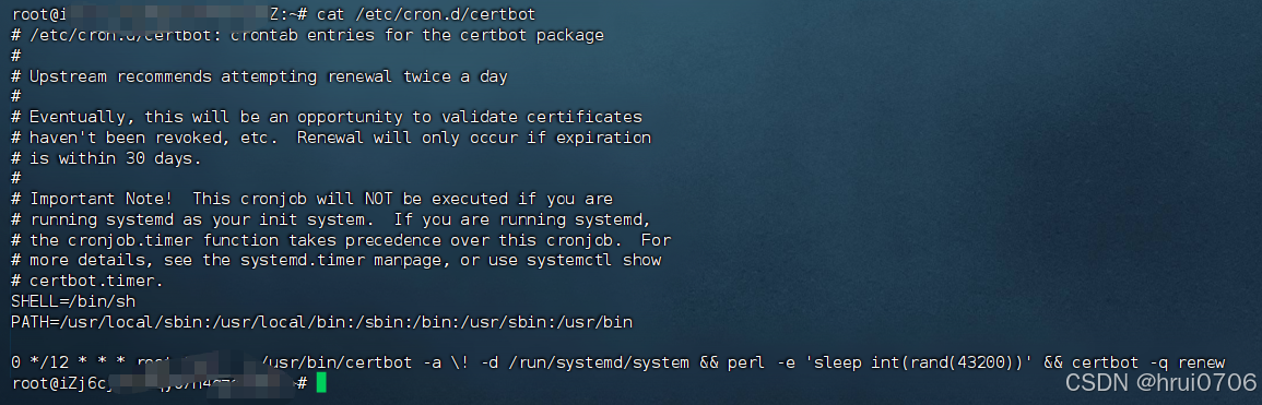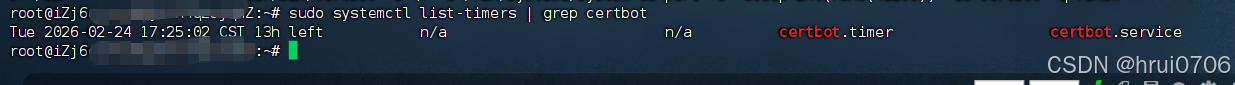 test -x /usr/bin/certbot -a \! -d /run/systemd/system && ...。这个命令会检查系统是否正在运行 Systemd。如果检测到/run/systemd/system目录存在(这是 Systemd 运行的标志),那么这条 Cron 命令的后续部分(perl -e 'sleep...' && certbot -q renew)将不会执行,Cron 任务会静默退出。这样,就确保了只有 Systemd 定时器在履行职责。查看 systemd 定时器(如果存在)